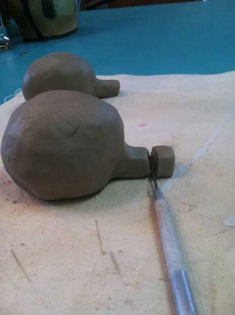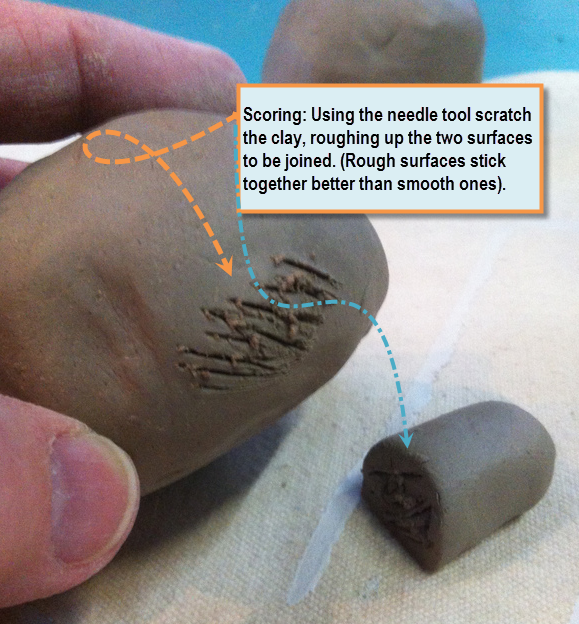 Puntuación de las dos piezas de arcilla donde unirse con una herramienta de la aguja y suave la boquilla en el cuerpo del silba.