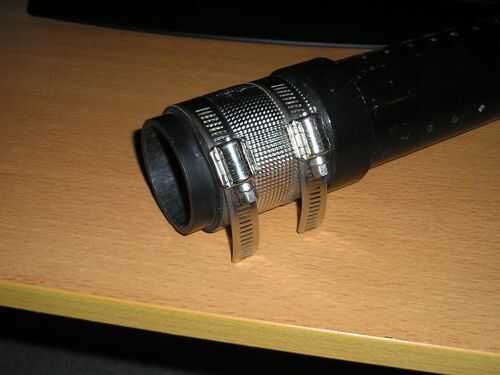 No pensé que esto era lo suficientemente confiable por lo que he añadido una extensión para el silenciador que es donde se utilizaba el "hub". Básicamente, una pieza de ABS del mismo diámetro (ID y OD) como el extremo pequeño del acoplamiento es empalmado contra el acoplamiento y la envuelve y sujeta alrededor de la costura a unirse a ellos. La pieza de goma del cubo debe exprimir a través de la articulación como las abrazaderas estén apretadas y crearán un sello de goma que se apoderará del cañón del canon cuando el silenciador está instalado. Por las fotos espero que entiendan lo que quiero decir.