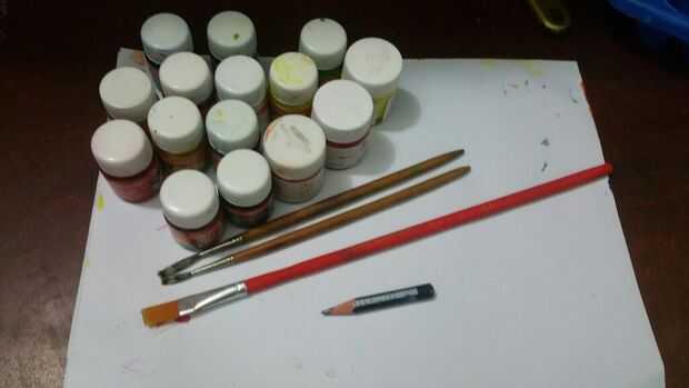 Estoy usando para esta pintura colores, lápiz, pincel, papel blanco, agua, escala, brújula