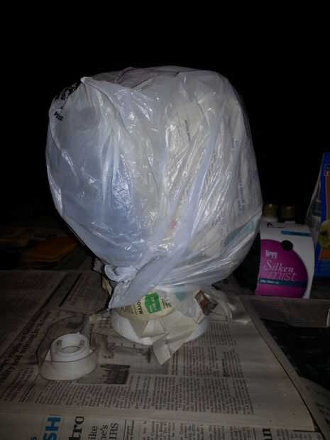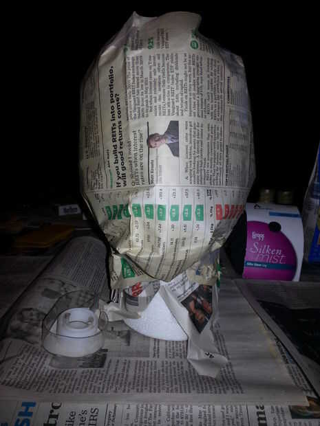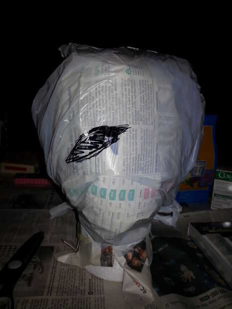 Comencé por envoltura de periódico alrededor de la cabeza y con cinta Scotch para mantener en su lugar. Luego tiró una bolsa de plástico sobre la cabeza y creó un aspecto más grotesco fastidiando dos bolsas de plástico y pegar en la parte posterior de la cabeza, entre el diario y la bolsa que tiró sobre la cabeza.