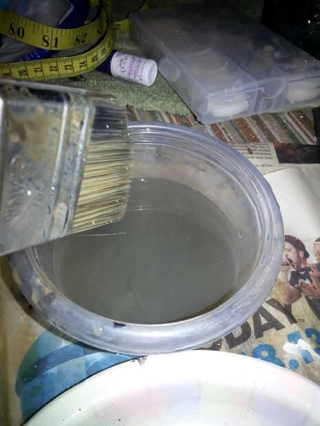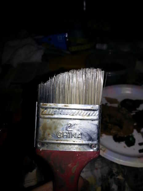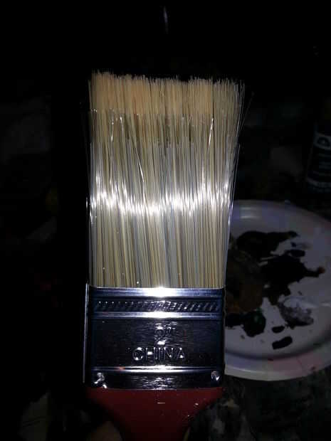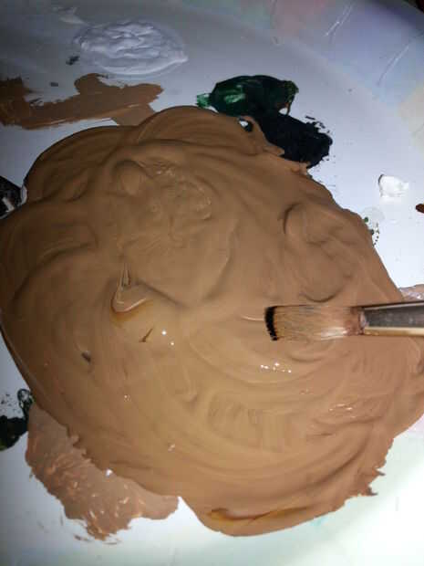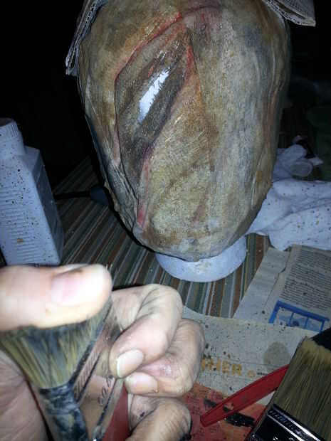 Finalmente, llevaron a uno de mis pinceles para pintar 2" cortar hacia abajo en un ángulo, había empapado en agua y utilizado para"aerógrafo"algún marrón y negro en la máscara entera para cubrir cualquier perdidas puntos.