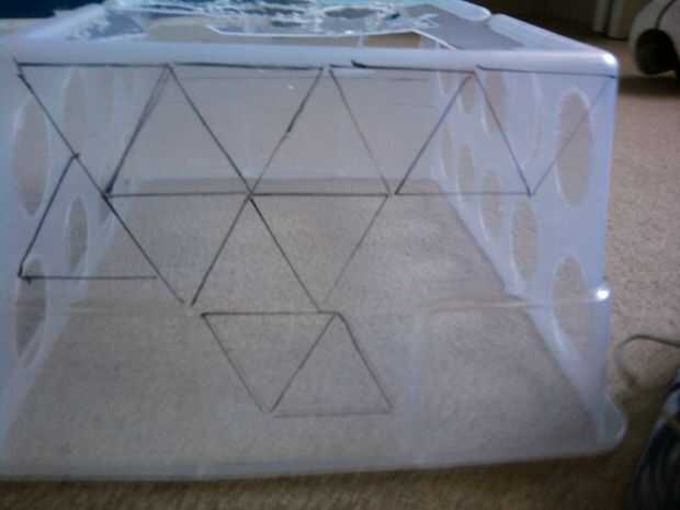 luego con un rotulador, contorno 16 triángulos utilizando la plantilla en su caja de plástico