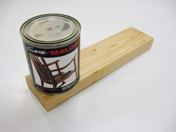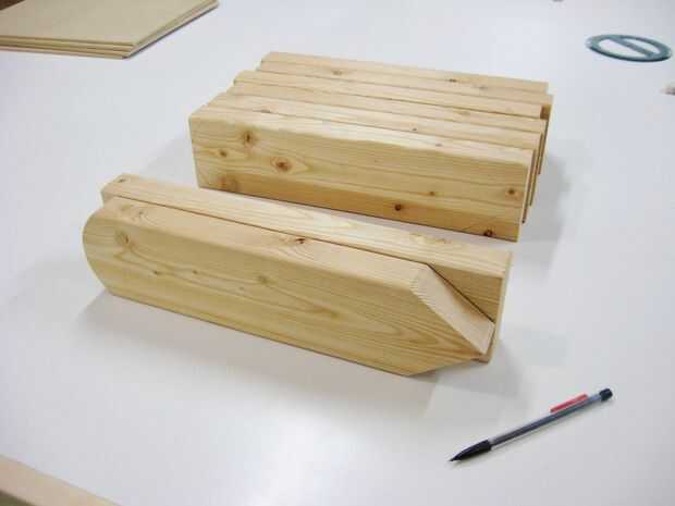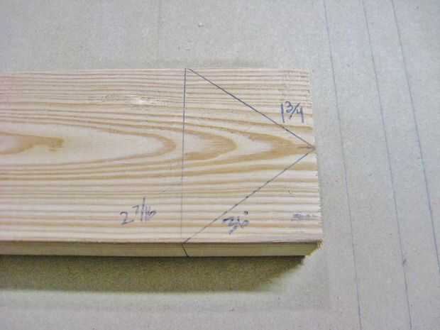 Diez piezas de 2 x 4 se redujeron de 14 pulgadas de largo, con un ángulo de 72 grados centrado por un lado y un redondeado en extremo por el otro.