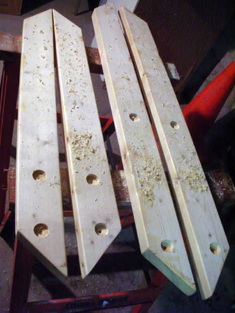 Las piernas se unen con pernos de máquina de 3/8". Me hundí en los agujeros para los pernos dar un buen acabado. Abrirá un orificio de 1/4" a 3" desde el extremo del piso de cada uno, para el elemento de tensión más adelante.