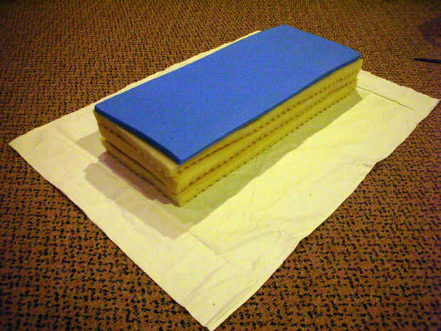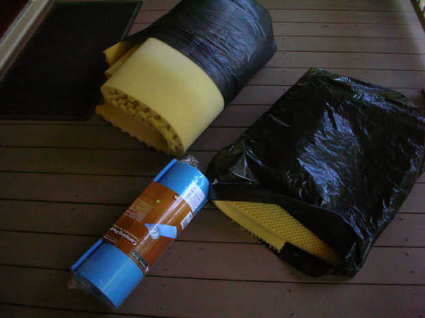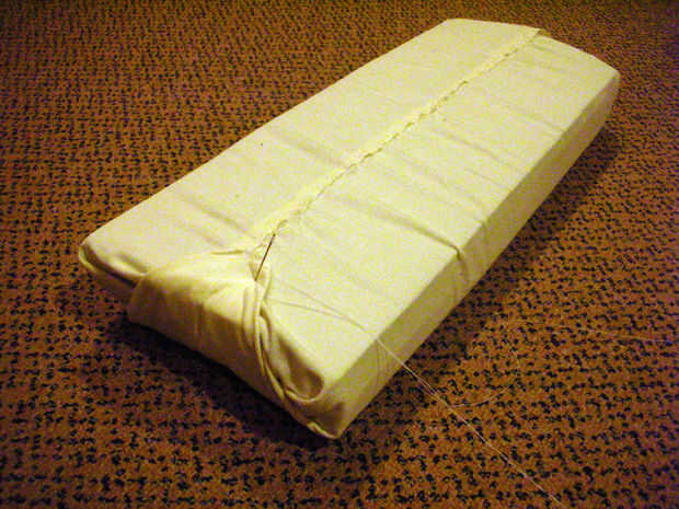 Dimensiones, una vez más, se varían, pero los cinco cojines principales son todos de 20 "x 8". Las imágenes cuentan la historia en cuanto a la espuma de embalaje en tela - es exactamente lo mismo que envolver un regalo de Navidad. En lugar de cinta scotch, asegúrelo con alguna costura látigo simple--básicamente sólo grande, colocación de puntos de sutura. Pongo la espuma azul, densa como una capa de fondo en cada cojín, cubierto con dos capas de colchón. Doble densidad para máximo confort.