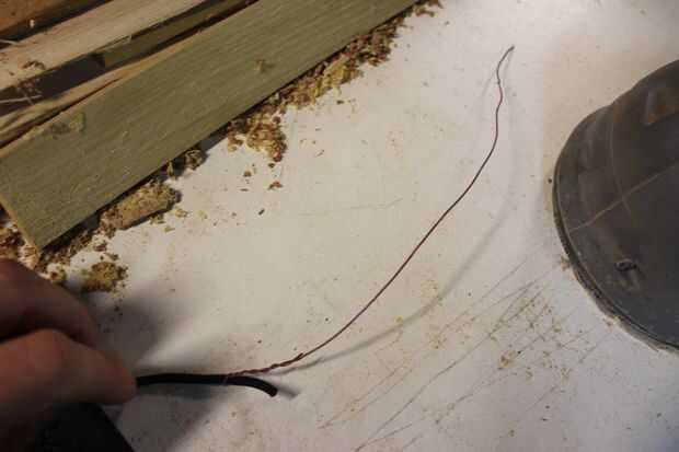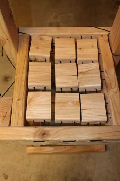 Para hacer esta parte más fácil torcer un alambre fino alrededor de la médula para a salmodiar a través de los bloques más fácil (ver tercera imagen). Con todos los agujeros perforados puede empezar a tejer el cordón para a través de los lados de la silla y luego regresar en los otros lados del bloque (véase la cuarta imagen). Hacer esto para las tres filas. Una vez que haya terminado haga lo mismo este tiempo a partir de la parte delantera y volver.