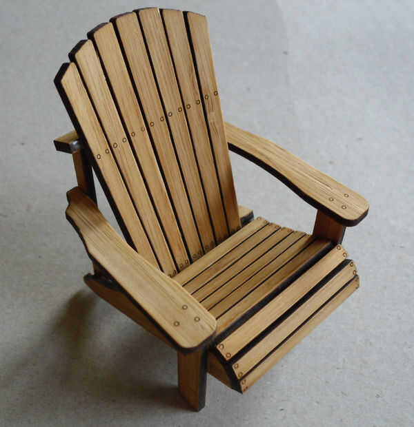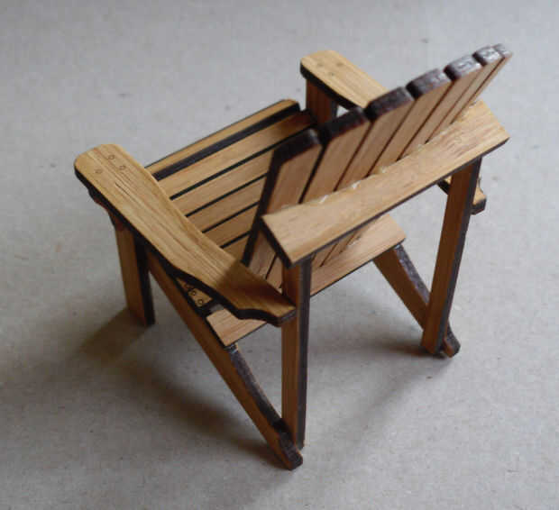 La silla se corta de una hoja plana de bambú y dos sillas pueden hacerse de la hoja. Las hojas de bambú cortado pueden pedirse de mi showroom en Ponoko.com. Una vez que reciba las piezas cortadas, puedes seguir la guía para construir tu miniatura.