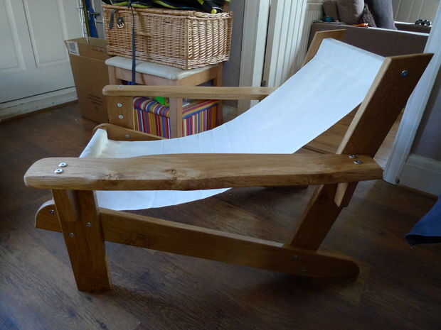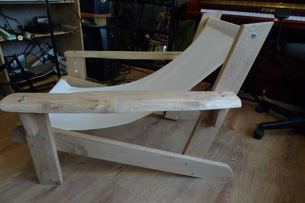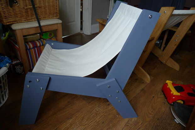Yo había hecho una silla como esta una goma manguera silla por Wholman pero con la cuerda y aún tenía algunos contrachapado cortado a las dimensiones correctas, así que antes de entrar directamente en este proyecto hice una silla de madera y lona para probar el método de fijación y probar mis conocimientos de costura.