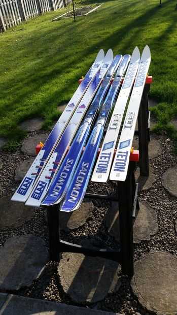 Hice mis sillas con 3 pares de esquís; sin embargo, he visto diseños con 4 pares, 5 pares, incluso más. Ser creativo con cómo y dónde utilizas son más fuertes de lo que piensa. Compré los esquís usados en las tiendas de segunda mano locales y en línea para alrededor $10-$20 por par.