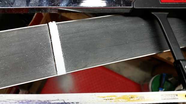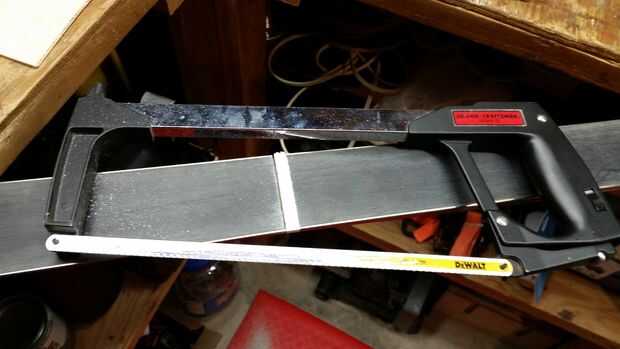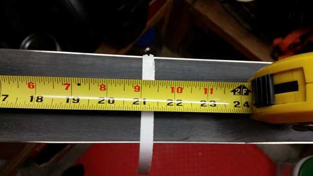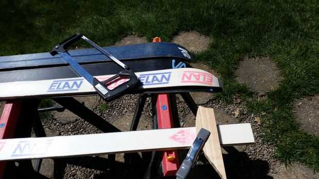 Los esquís necesitará cortar dos veces, una vez la pieza de asiento y una vez la silla hacia atrás. Mi asiento es 21" de ancho y mi rango de piezas de la espalda de 38" a 45". Se venden esquís por longitud en centímetros (cm). Cuando en busca de esquís comprar, asiento mínimo usted necesitará construir 21" y 38" volver pieza 150cm, pero esta longitud variará basado en su diseño. Mida dos veces, corte una vez. Utilicé cinta para marcar líneas, y una con pieza de madera para ayudar a iniciar una escalera corta, después hizo los cortes con una sierra de 12".