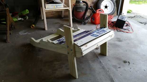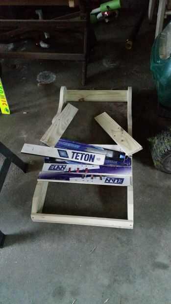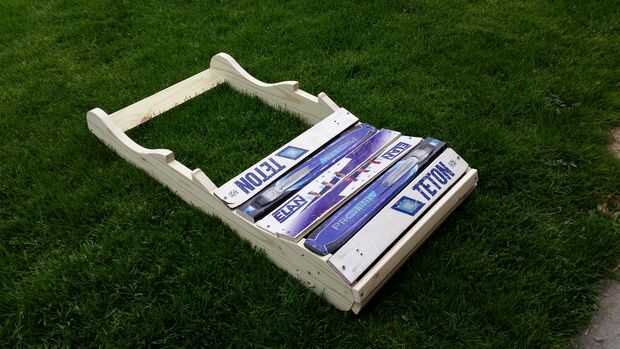 Utilicé tornillos de grado exterior de 2" para sostener el grueso de la madera y la esquís juntos y (3) 5/16" x 2,5" de cabeza hexagonal tornillos con arandelas y tuercas para sujetar las patas delanteras. Tres pernos es probablemente un poco exagerada, pero funciona y eran baratos.
