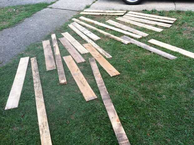 Pone todas las tablas (se trata de 2 palets). Tendrás algunas placas astillados, y algunos no van a ser tan bonito como otros. Si son todos difusión hacia fuera usted puede fácilmente seleccionar qué tablas utilizar. MANTENER A TODOS ELLOS!!!! Algunas piezas será bastante cortas, y aunque algo se astilló gravemente o deformado, tiene uso si se corta sólo las partes malas.