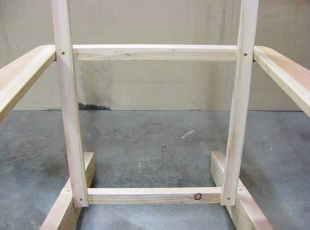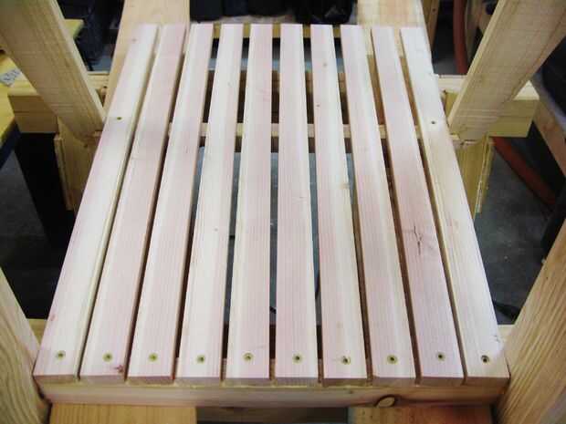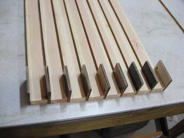 Coloque cada listón con pegamento en ambos apoyos, pero sólo atornillarlos a la abrazadera de la parte inferior primero. Una vez que todos los listones se atornillan al soporte inferior, ajústelas hasta que la distancia a lo largo de la parte superior se ve incluso y luego tornillos a través de los listones en la abrazadera superior para bloquear en lugar.