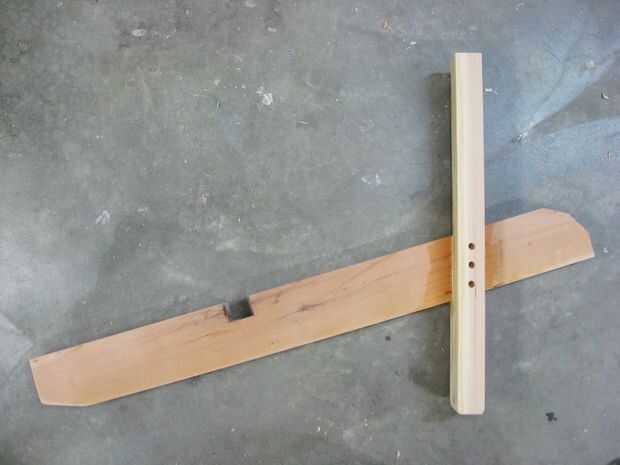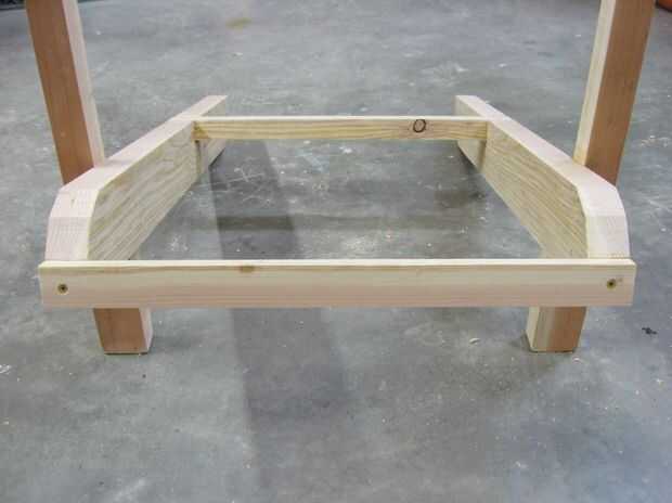 Montar cada sección de asiento-pierna delantera como se muestra en foto 1. La pierna delantera se coloca con su cara frontal precisamente siete pulgadas desde el borde delantero de la Junta de asiento inclinado-leg. Encolar y atornillar las patas delanteras en el lugar.