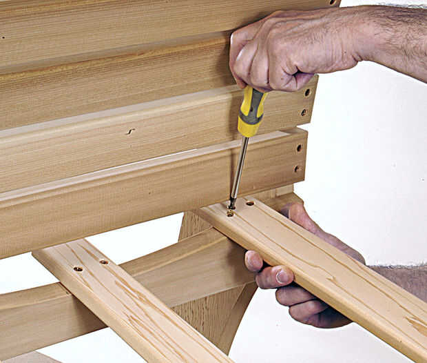 Instalar los dos listones exteriores. Fije los listones restantes para que coincidan los extremos superiores de la curva y los espacios son uniformes. Puesto que los listones traseros son el punto focal de la silla, cualquier brecha demasiado grande o demasiado pequeño, inmediatamente sacará el ojo, así uniformidad aquí es muy importante.