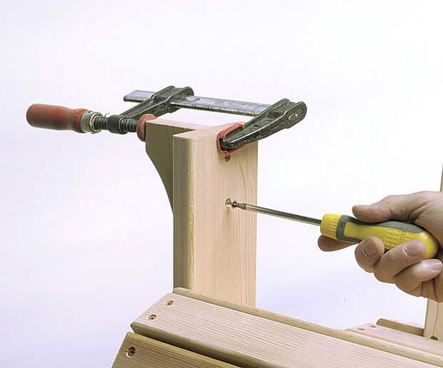 Cortar los brazos y apoyo para el brazo y los cantos. Temporalmente Fije los soportes en su lugar y asegúrelos con tornillos.