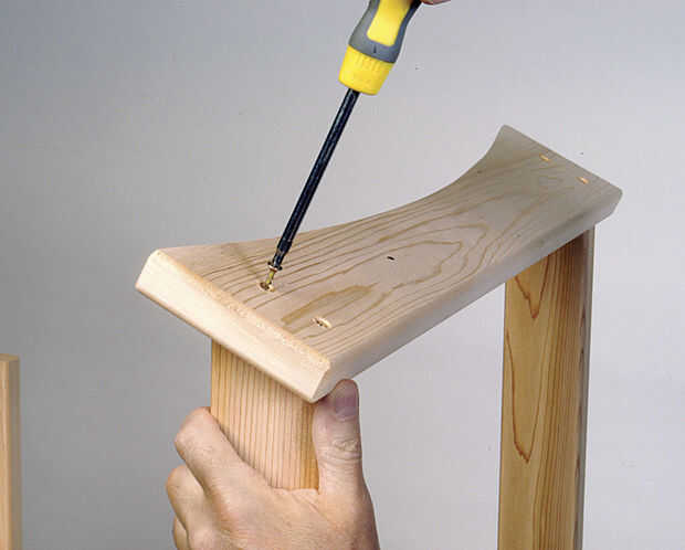 Atornille el riel posterior superior a los extremos superiores de las patas traseras, y coloque la silla sobre su parte posterior para instalar los listones de la parte posteriores.