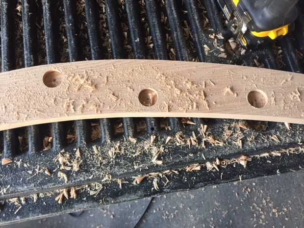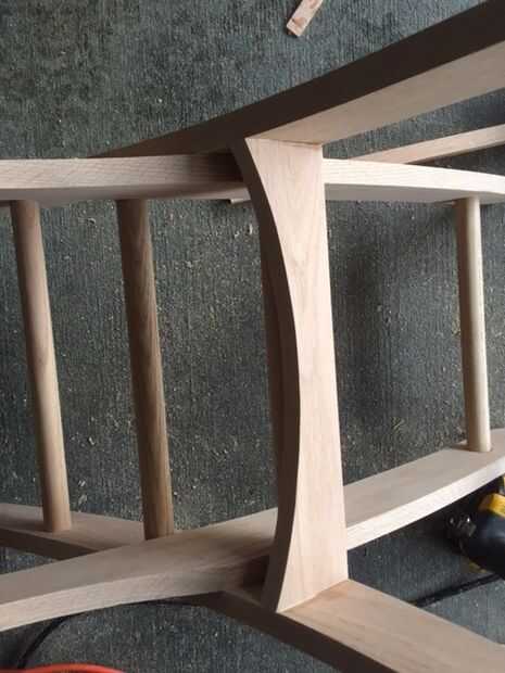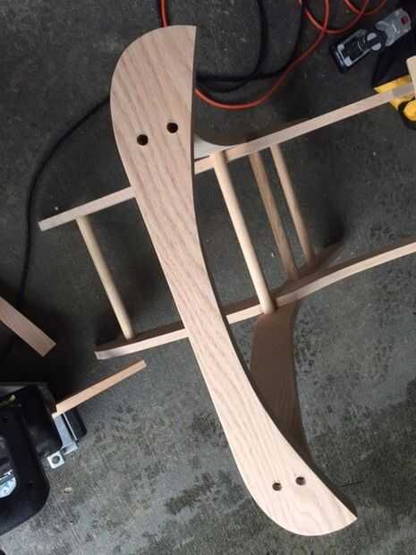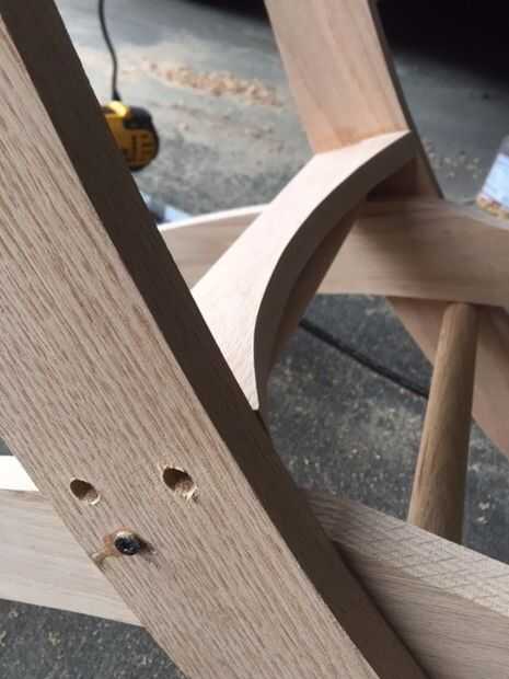 El siguiente es un espaciador para mantener la parte superior de la espalda a la distancia correcta para que puede instalar al espaciador trasero curvo. Una vez más, atornillado y pegado. La parte más delicada de este paso es conveniente al espaciador inferior de la espalda. Tiene que caber dentro de los montantes traseros e inclinar en el ángulo correcto para aceptar los listones de la parte posteriores. Utilicé un listón posterior para conseguir la alineación adecuada entonces permanentemente fijada en su lugar utilizando el método descrito anteriormente.