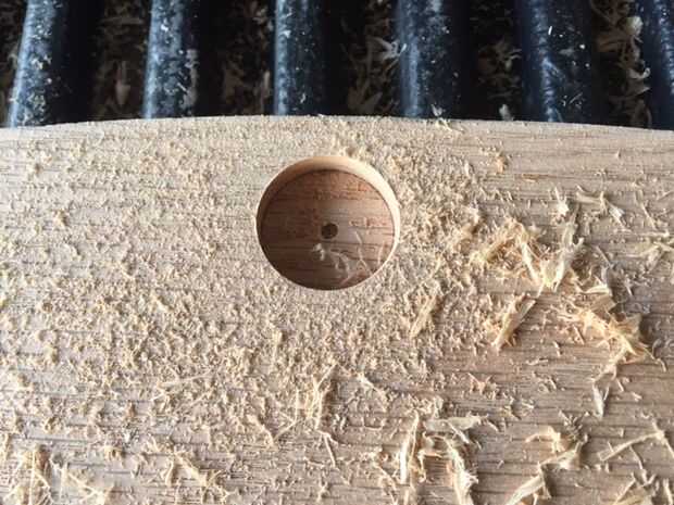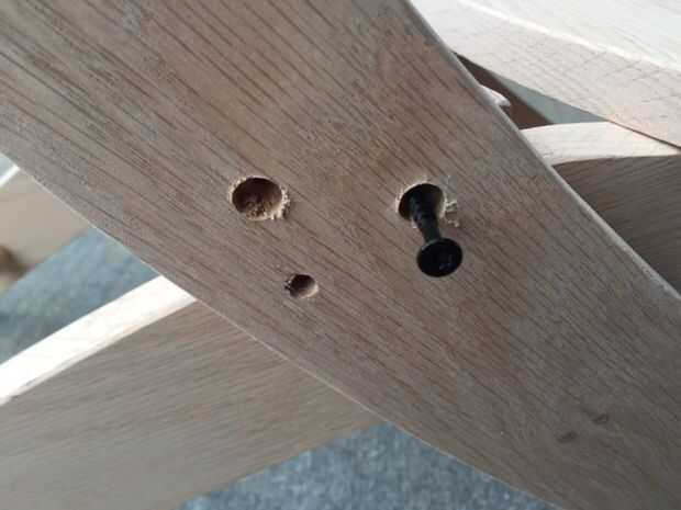 Los planes llaman para que algunos tornillos muebles unir las piernas y los tacos. Sabiendo la fuerza del Titebond III, perforó un agujero profundo 1/4", sándwiches un montón de pegamento en un roble de 1/4" espiga, condujo hogar y lijar al ras. Como los orificios tapados, desaparece casi totalmente después de aplica el acabado.
