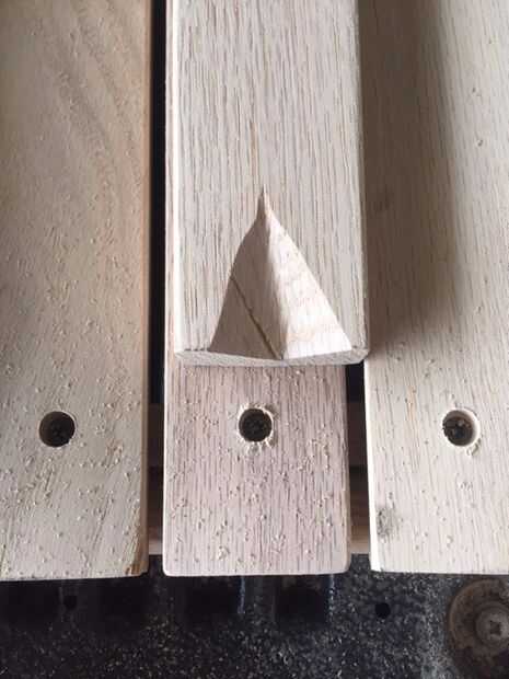 Los dos exteriores listones necesidad una muesca cortada en ellos para que se sientan sobre los espaciadores. Me mantiene en su lugar y localizar la ranura. Entonces usando el tirón de la sierra en ángulo y corte las muescas. No son especialmente bonitos, pero nadie las pueda ver.