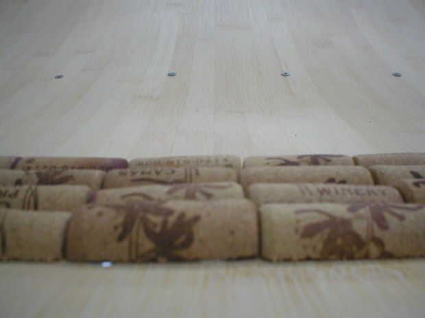 Comenzar hacia fuera poniendo hacia fuera los corchos en la inmersión de la silla, esto hará que sea fácil como usted trabaja su manera hacia el borde. Pude ajustar ancho 11 tapones. Asegúrese de que es el primer par de líneas y cuadrados para arriba con el borde de la silla, no quieres tener corchos escurr el borde como trabajar su manera para arriba. Una vez que sientes que tienes una buena línea para comenzar con, comenzar a pegar. Al llegar el punto que la silla se fija al soporte y los tornillos están pegando un poco, tallar hacia fuera un poco del interior de corcho antes de pegar hacia abajo. seguir haciendo esto hasta que tenga el mismo espaciado en los laterales como la parte superior e inferior. Deje que el pegamento se seque antes de aplicar la capa de acabado.