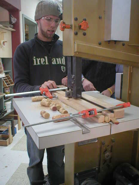 Configurar una plantilla con una sierra de banda que me permitiera hacer los corchos a través de uno en uno. Va a ser diferente para cada Sierra de cinta a explicar cómo lo hice para éste. Tomé dos piezas de madera y puso justo lo suficientemente lejos para permitir que una línea de corchos para descansar en el medio. Haz una tercera pieza de madera y cortarlo para que cubrirá el espacio entre y suficiente para clavar a las dos primeras piezas de madera. una vez que la pieza superior es cortada, corte de 2" de un lado. Clavo los pedazos juntos dejando un espacio en la parte delantera, esto le permitirá deslizar sobre la banda de la sierra. Clavo ahora 2" pieza en la parte delantera que hay suficiente espacio para que la hoja pase sin golpear la tapa de madera. Configurar su guía por un lado y sujetar la plantilla a él. Verifique que la plantilla esté centrada con la cuchilla. Ahora, uno por uno comenzar empujando corchos en la plantilla, debe haber suficiente espacio que el corcho que se está insertando es empujar el corcho frente a ella a través de la hoja. Si no hay suficiente espacio en la mesa de Sierra de cinta, use una vara para empujar. Repita esto hasta que han cortado todos los 600 corchos y ahora tiene 1200 mitades. ayuda a tener una caja en el suelo para coger las piezas cortadas.