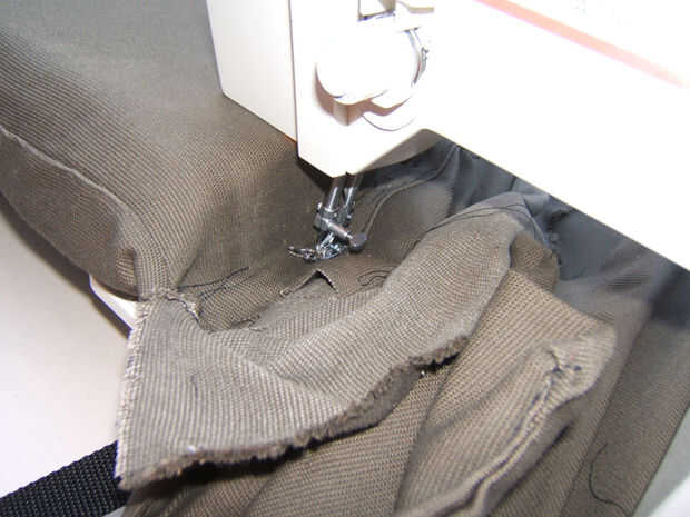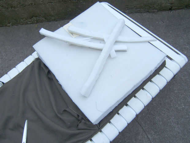 Una vez que la espuma es cuidadosamente en su lugar y colocado como usted quiere, prender a la tela sobrante para el centro de la silla tan cerca de la espuma como sea posible. Entonces rápidamente coser a la tela juntos, quitando los pernos como vas. Dependiendo del tamaño y configuración de su máquina de coser, esto es más fácil decirlo que hacerlo. Esto puede tomar un tiempo y hace la loca. Lo siento, pero hay que hacerlo.