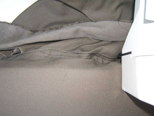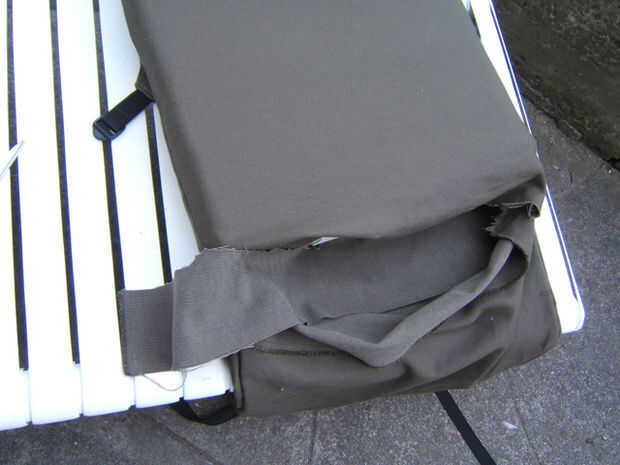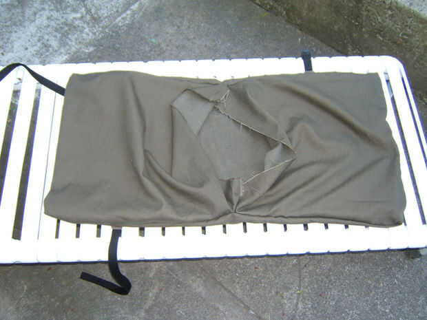 Una vez hecho esto, corte una longitud de tela de 5" de ancho y 21" de largo. Doble la pieza de tela que ha cosido solo abajo para que ninguno de los bordes expuesto y se coloca sobre este nuevo pedazo de tela que han cortado justo. En otras palabras, la nueva pieza de la tela debe estar entre el respaldo de la silla y la solapa superior. Coser esto poner la máquina en marcha atrás y volver sobre él. Debe incluso poner probablemente más puntos que si no desea que la costura a rasgar hacia fuera. Una vez más, esto es más fácil decirlo que hacerlo, pero hay que hacerlo... por lo que es poco lo que puede hacer al respecto.