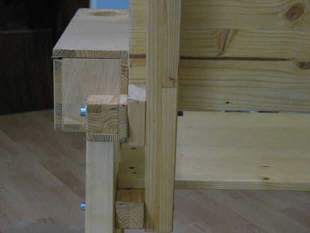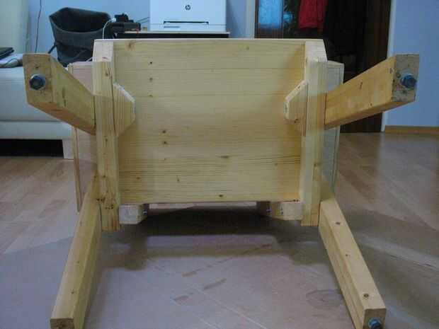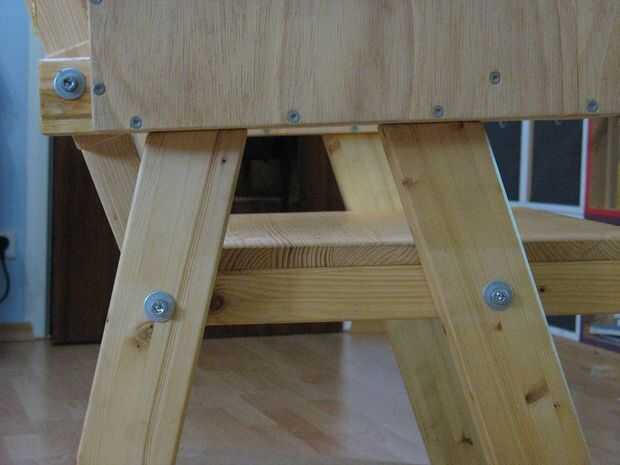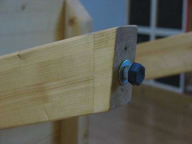 Los tornillos de las tuercas del parte movible en las piernas son de 40 mm de largo. Pronto descubrí que este era demasiado largo. Sería mejor tomar 30 mm o 25 mm pernos para evitar molestas sesiones atornilladas.
