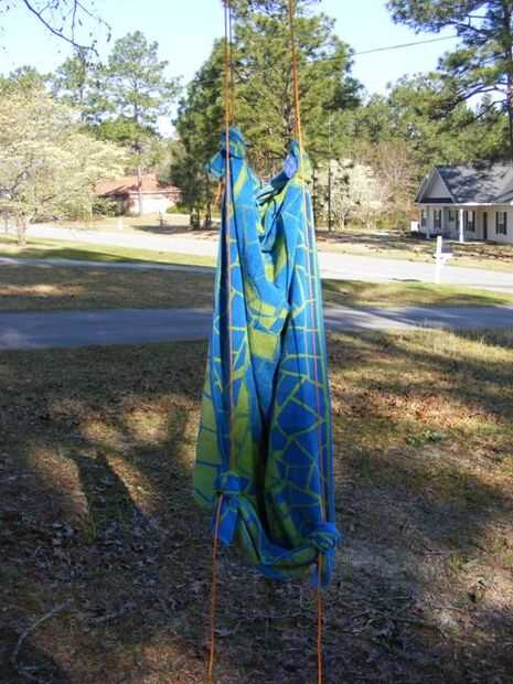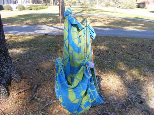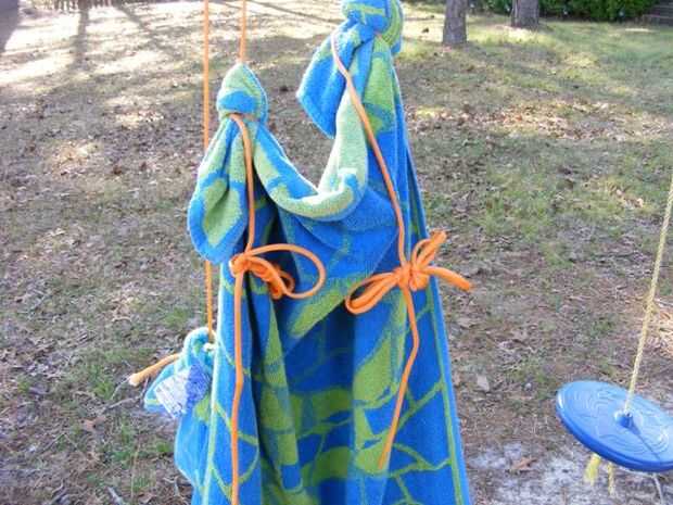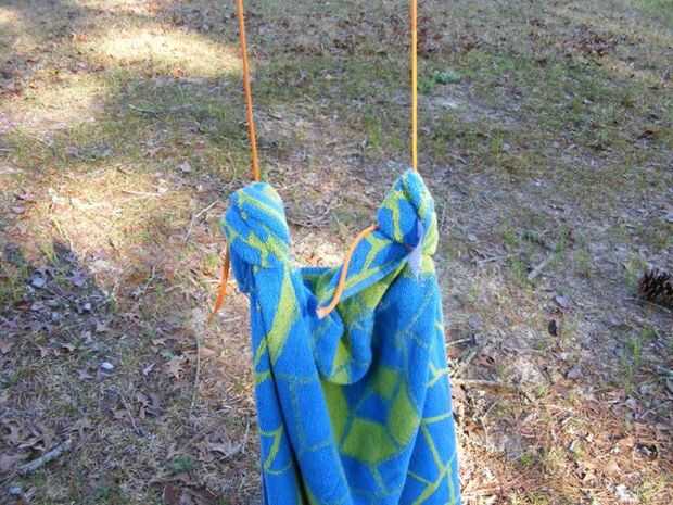Izar la toalla para que la toalla está colgando verticalmente a la altura del hombro aproximadamente para la persona que va a utilizar la silla. Levante una esquina de la parte inferior de la toalla para aproximadamente la altura de la cintura y la hoja de doblar la esquina para el extremo suelto de la paracord en el lado apropiado. Repita para la otra esquina. Apriete ambas curvas de la hoja con cuidado. Habrá algunos adicionales de cable colgando de la parte inferior de la toalla. Paquete y atar el cable sobrante para que no arrastre el suelo.