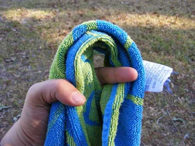 Designar a un extremo de la toalla como "top". Designar un paracord como "izquierda" y el otro como "derecho". Tomar la "izquierda" paracord suelta final y hoja curva a la esquina de la toalla en la parte superior termina en el lado izquierdo. Repita con el cable de "derecho" en la esquina superior derecha de la toalla. Asegúrese de apretar la hoja se dobla cuidadosamente.