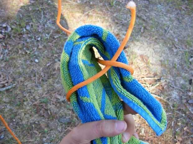 Para atar el nudo, simplemente tome la toalla o el grueso de las cuerdas y hacer una curva de 180 grados. En el lenguaje de nudo-atar, esto se llama una "Ensenada". (Fig. 1)