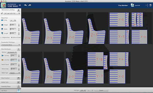Acostumbraba hacer Autodesk 123D, que hace rebanadas 2D de modelos en 3D. Al tiempo que hice esto (cerca de un año y medio atrás), 123D Make era relativamente nuevo, por lo que no había mucho en el camino de documentación o tutoriales, algo que ha cambiado los senos. También hubo poca capacidad para modificar para requisitos particulares donde las rebanadas de ir (las rodajas tienen que ir en la misma dirección, como en las imágenes de arriba). El problema era que quería mis rebanadas de alrededor de la curva con el perfil de la silla. Lo que terminé haciendo para trabajar alrededor de esto era crear tres modelos individuales con slice diferentes patrones, con la intención de concatenar a ellos después.