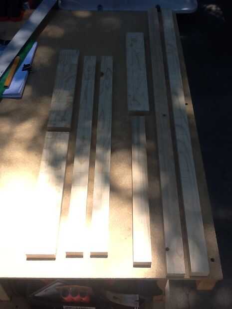 Por lo que ahora debe tener 8 piezas de madera marcado para la perforación.  El 1x2s debe tener sus marcas en el medio y el 1x3s debe ser 3/4" en de un extremo.