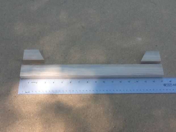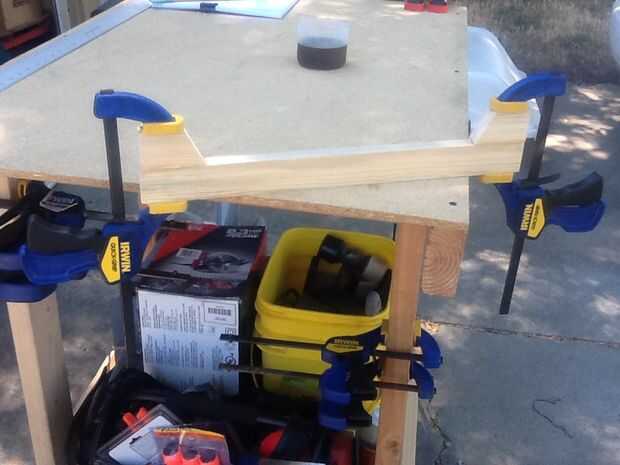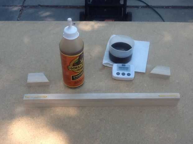 Tomar los dos bloques cortos, angulados y pegarlos a los 17" pedazo de 1 x 2. El borde largo de los bloques de ángulo debe estar en contra de 17" pieza, con las pistas hacia dentro. Yo estaba usando el gorila de pegamento, por lo tanto, el plato de agua para que las cosas húmedas y el temporizador. Conjunto de pinza y dejar que el pegamento.
