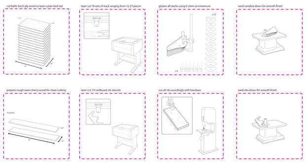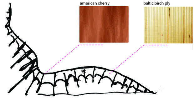 El objetivo principal para esta butaca fue establecer un perfil cómodo. Me puse en lo que es enteramente de madera y usando una tabla de la CNC sobre complicaría construcción porque todas las partes tenían curvas complejas. Nunca había parado detrás de él para averiguar cómo construirlo pero yo sabía que tenía que encontrar un punto común para medir desde. Irónicamente, la constante sólo parte del diseño fue el perfil que estaba obsesionado por mantener por lo que terminó siendo el vector de registro que utilizaría. Pensamiento acerca de cómo utilizar el pegamento tradicional, plano ups para lograr esta forma radical. Haciendo referencia a esta línea, pude cortar secciones a lo largo del vector normal de todos los segmentos.