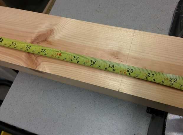 Es importante que el corte en el centro de la madera por lo que las dos piezas resultantes son del mismo tamaño - para ello hice un corte corto en un extremo, luego midió la distancia de la valla para el corte y ajustar la posición de la valla hasta la sierra iba a dejar la misma cantidad de madera en ambos lados.
