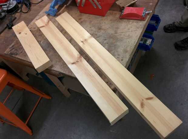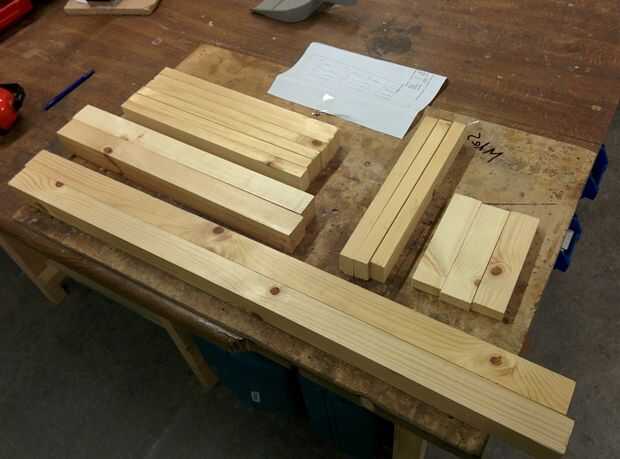 Primer paso fue cortar todo 2 x 4 de la longitud que quería: 50cm, 90cm y 100cm. Una cinta métrica, lápiz y mitre Sierra hizo un trabajo rápido de esto.