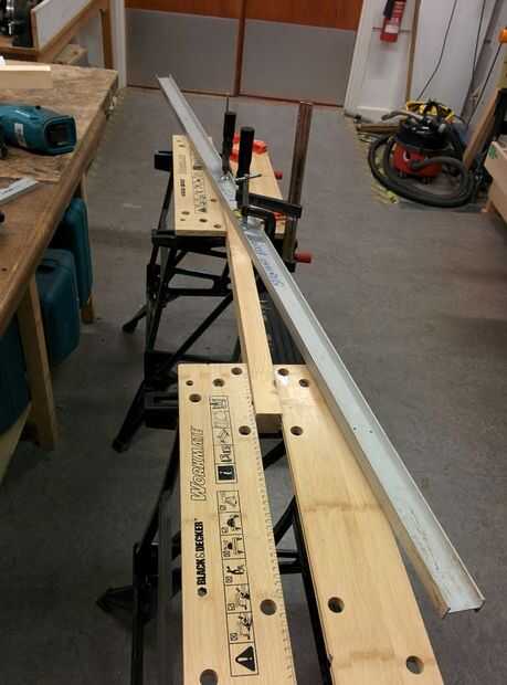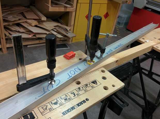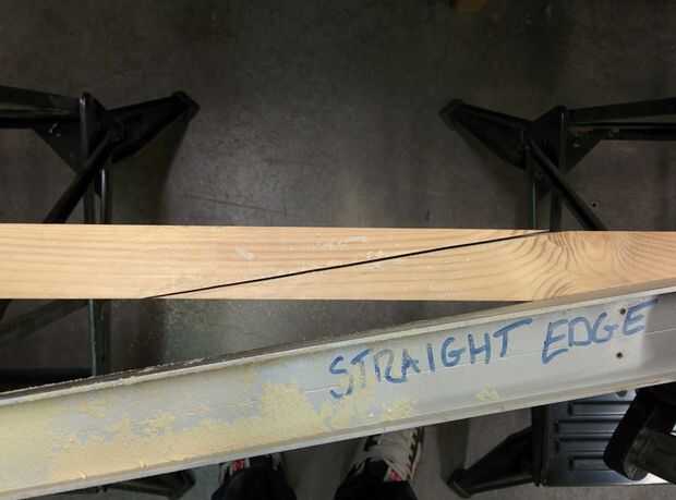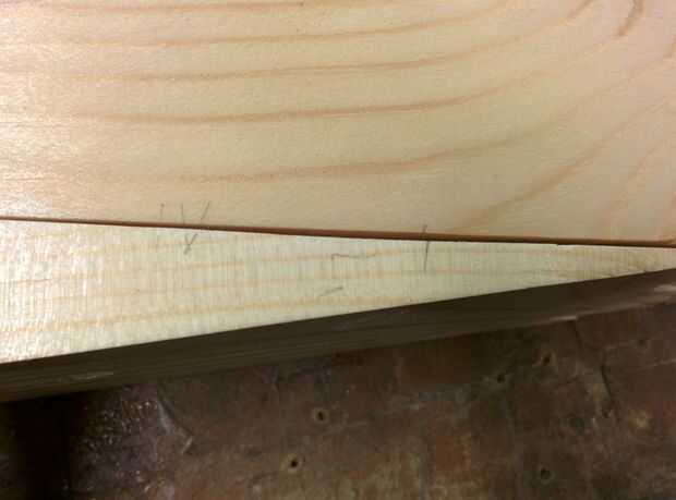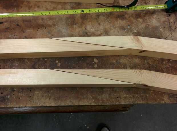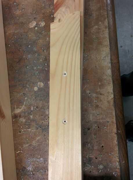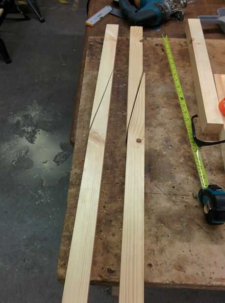 Lo 90cm de 2 x 2 no caben en la Sierra de cinta y confiablemente no podía obtener un corte perfectamente recto en él de todos modos. Esta es otra parte del proceso que habría sido mucho más fácil con una sierra de mesa. Como es, tenía que sujetar el 2 x 2 entre dos bancos de trabajo y fije una regla larga que en un ángulo de 10 grados para guiar la sierra caladora. 10 grados es el ángulo más que me hubiera gustado, pero nada menor habrían hecho el corte excesivamente largo - cada corte era cerca de 25 cm de largo y tomó varios minutos de minuciosa jigsawing, pero terminó con una superficie de corte era lo suficientemente plana para pegar encima de. Estas juntas fueron los únicos que utilizan tornillos, porque sólo los amarre juntos resultó en dos mitades, desplazamiento perforado y avellanado dos agujeros a través de cada articulación para aceptar tornillos de madera que las dos mitades en la posición correcta mientras seca el pegamento.