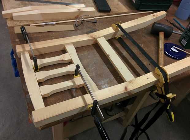 Con todas las piezas hechas, era hora de empezar a montar. La forma más sencilla de montar una silla de esta forma es unir la parte de atrás como una sola pieza, y la parte delantera del mismo modo, luego fijar las dos piezas del marco junto con los lados del asiento y camillas.