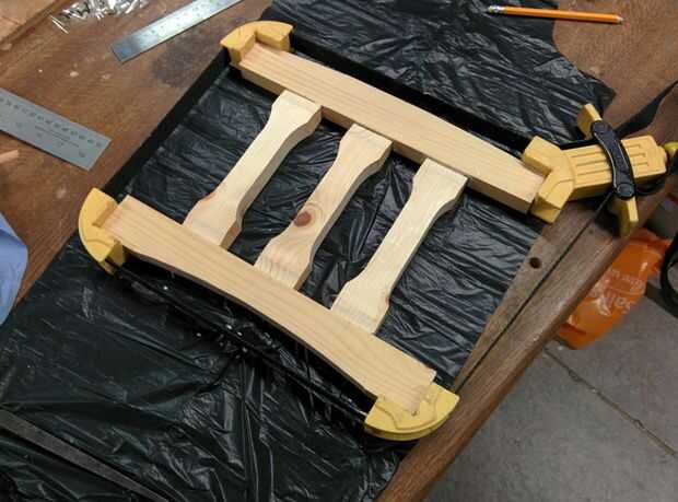 Pegar la espalda requiere un poco de ingenio como no tengo una sola barra abrazadera lo suficiente - le recomiendo que figura a este tipo de cosas que antes de empezar ya que es bastante estresante tratando de improvisar arreglos de sujeción mientras se está secando el pegamento!