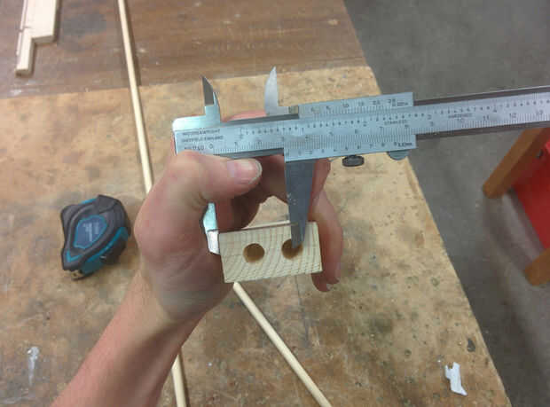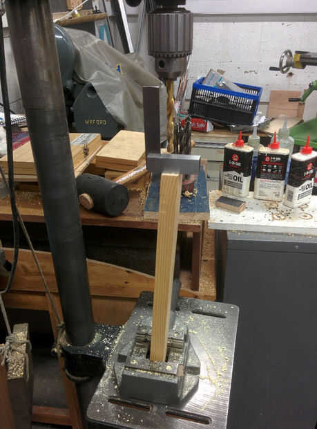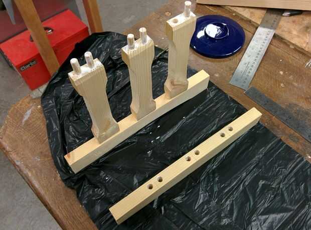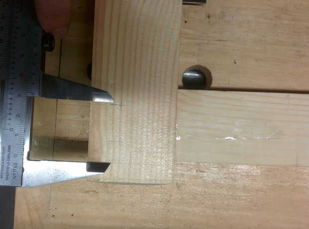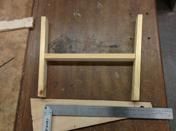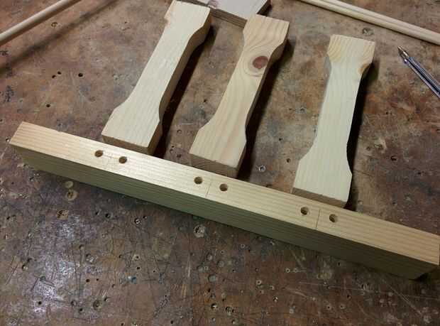 La primera parte a montar fue la parte de atrás. Para hacer las juntas de espiga taladros dos 28mm profundidad, 9mm de diámetro en los extremos de los largueros y los lados de los rieles y pegar una sección de 50mm de espiga de 9mm en las articulaciones. Los agujeros eran más de lo necesario para poder dar cabida un poco de pegamento en los extremos.