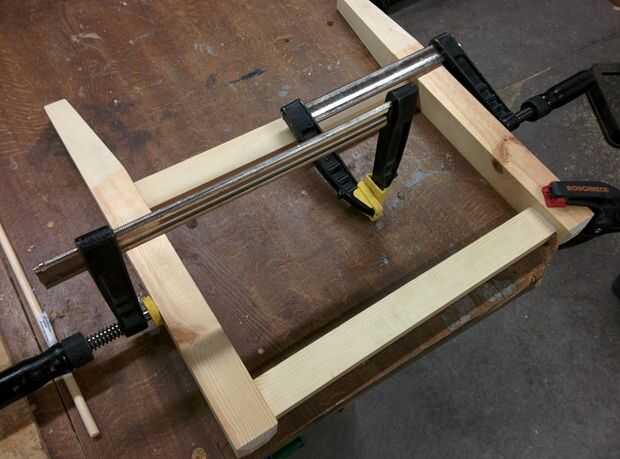 Una vez hecho esto la manera dura, recomiendo taladrar los orificios en los extremos de los largueros, medir su posición y perforar los orificios correspondientes en los rieles, porque perforar exactamente había colocado agujeros en la veta de la madera blanda era complicado.