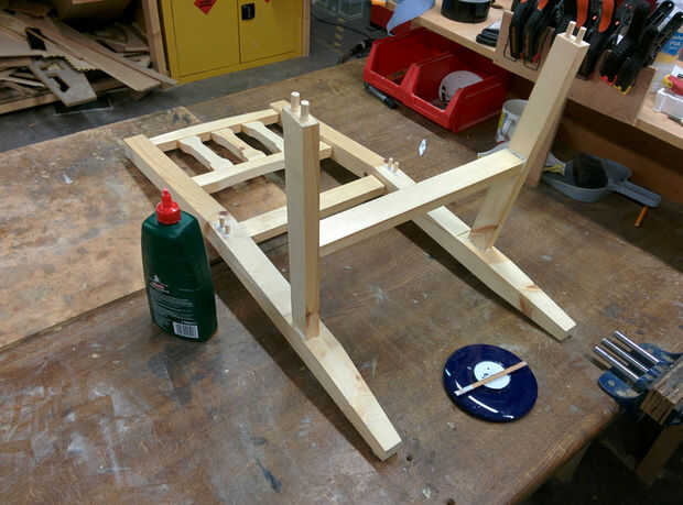 Derecho. Respira hondo y prepárate mentalmente. Todo lo que necesitas poner donde es accesible: un pote del pegamento, palillo de separador, un montón de toallas de papel para limpiar para arriba squeezeout, suficientes clavijas de longitudes apropiadas y todas las piezas del marco.