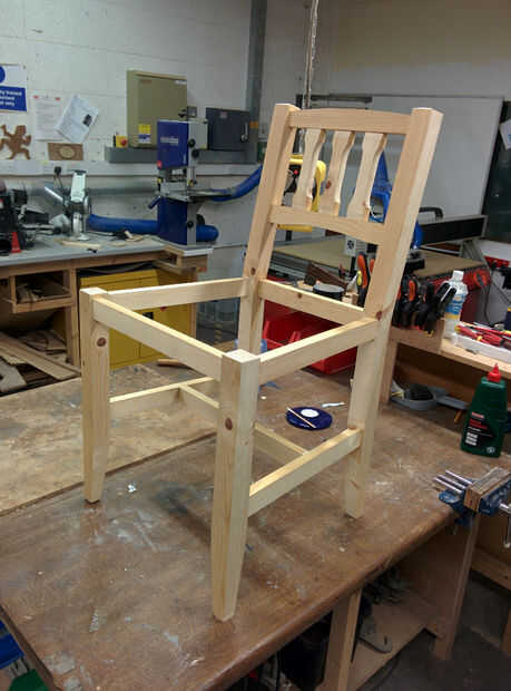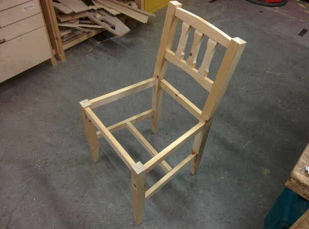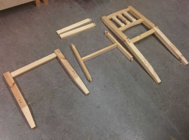 Coloque el respaldo de la silla en la mesa de trabajo hacia arriba, pegar todos los orificios e introduzca los taquetes. Pegar los extremos salientes de estos tacos y montar la camilla en el menor conjunto de clavijas. Pegue los lados del asiento y que encajen en las espigas superiores.