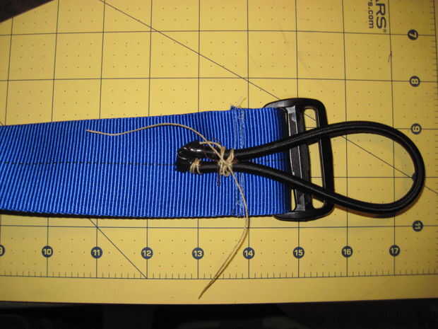 Ahora usted necesita doblar el cable de descarga a la mitad y coser los dos extremos justo detrás de la escalera de la cerradura para que asoma hacia fuera sobre la cerradura de la escalera. He utilizado un punzón costura para esto, pero probablemente trabajaría una aguja pesada.