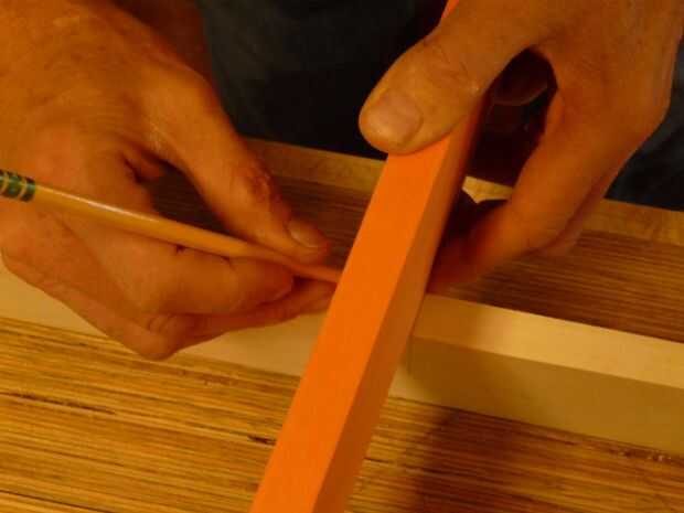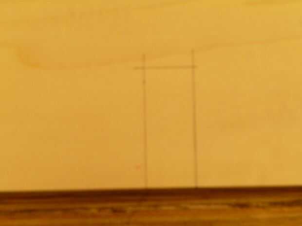 Para conseguir la anchura correcta para el corte, tomar una de las piezas y coloque sobre la línea por lo que es más la parte trasera del asiento. (Otra vez el PDF.) Esta anchura de la marca. Con estos biseles, dibuje las líneas de corte en la parte superior e inferior. También marca la profundidad del corte que es un poco más de la mitad. Usted está listo para cortar este conjunto.