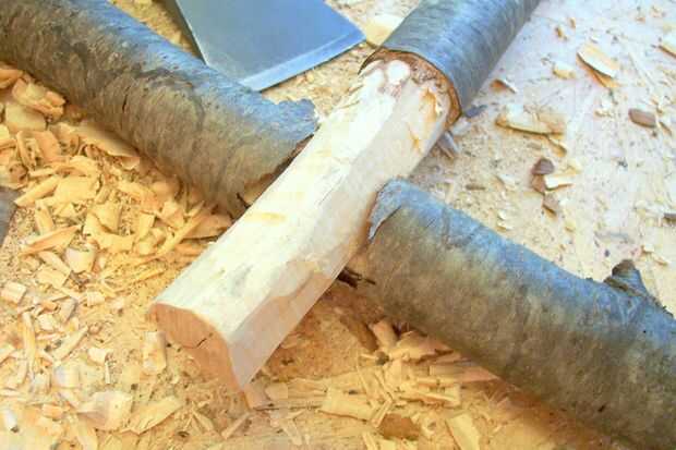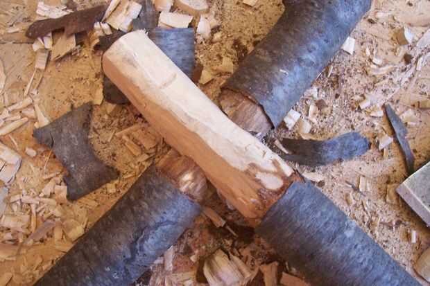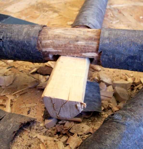 Cuña el, extremos ahora triangulares de la Llave de Cruz en los cortes de cola de Milano en las patas del armazón "A".