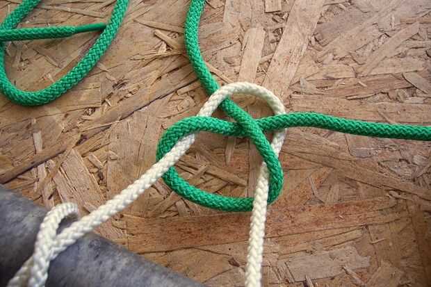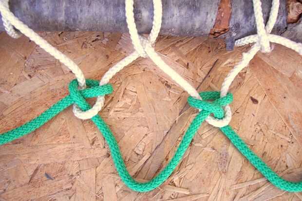 Es todo hecho con una cuerda continua. (Las fotos muestran dos cuerdas de diferentes colores para resaltar el nudo que ata el camino).