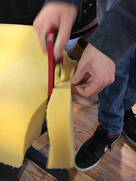 Medir el asiento y cortan un pedazo de espuma de memoria igual a las medidas. Sello de espuma con memoria en asiento con pegamento y dejar secar, luego proceder a tapar con el cuero. Sin embargo, esta vez, asegúrese de que utilizar pegamento en la parte superior del asiento y usar otra carpeta como grapas para conectar los extremos de la piel en la parte inferior del asiento.